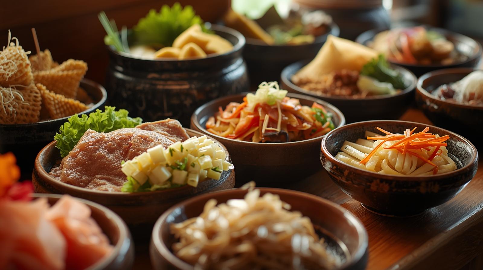 色とりどりの島野菜や伝統の味をビュッフェ形式で楽しみながら、三線やパーランクーが奏でる音色に耳を傾ける。